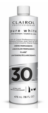 Pure White 30 Volume Extra Lift - Pure White mixes easily with any Clairol Professional hair color or lightener into a creamy consistency with easy spreadability. Pure White is laboratory stabilized to guarantee consistent, predictable results. 30 Volume Extra Lift is idea for extra lightening in a single process application or with powder lighteners.