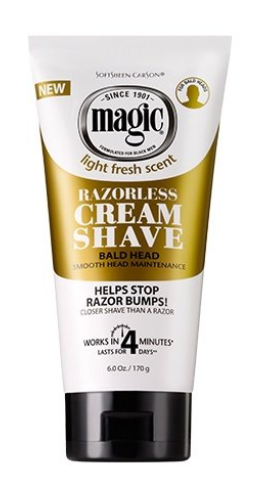 Give a closer shave than a razor and maintain bald head styles. Before using Magic Cream Shave for the first time, perform the sensitivity test. Ensure you wait at least 36 hours after using a razor or depilatory product before doing this test. Apply cream to a quarter size area of the beard. Wait 4 minutes. Remove. Do not scrape. Rinse area thoroughly. After 24 hours, if there is no sign of irritation or redness, continue with the rest of the head.